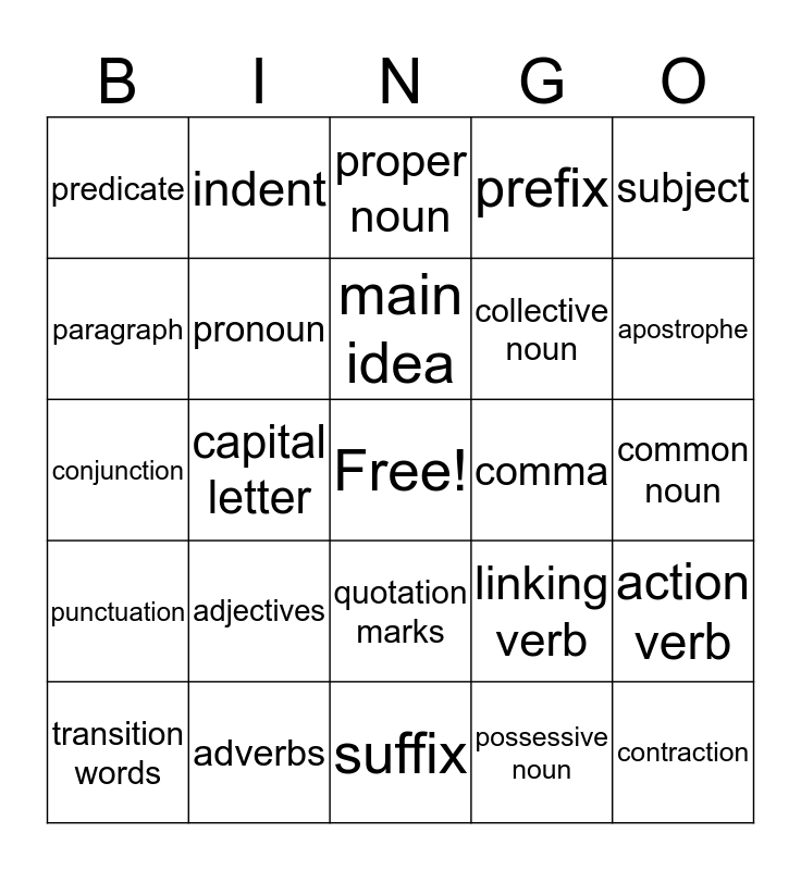 This bingo card has a free space and 24 words: adjectives, adverbs, main idea, transition words, subject, predicate, paragraph, indent, comma, quotation marks, collective noun, conjunction, linking verb, action verb, pronoun, possessive noun, common noun, proper noun, apostrophe, capital letter, contraction, punctuation, prefix and suffix.