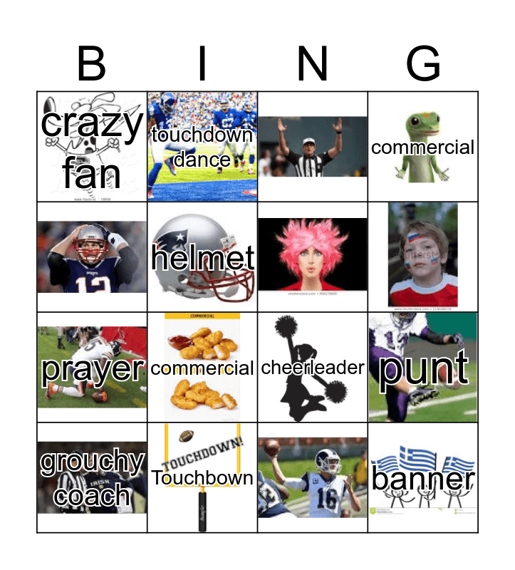 This bingo card has 16 images and 11 words: Touchbown, punt, crazy fan, prayer, touchdown dance, cheerleader, helmet, grouchy coach, commercial, commercial and banner.