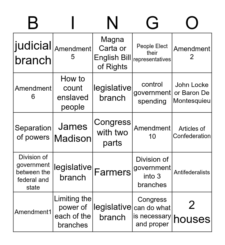 This bingo card has 25 words: legislative branch, legislative branch, legislative branch, Amendment1, Amendment 2, judicial branch, Amendment 6, Amendment 5, Amendment 10, Farmers, control government spending, Separation of powers, Division of government into 3 branches, Antifederalists, How to count enslaved people, 2 houses, Articles of Confederation, Magna Carta or English Bill of Rights, John Locke or Baron De Montesquieu, James Madison, Congress with two parts, Limiting the power of each of the branches, Division of government between the federal and state, People Elect their representatives and Congress can do what is necessary and proper.