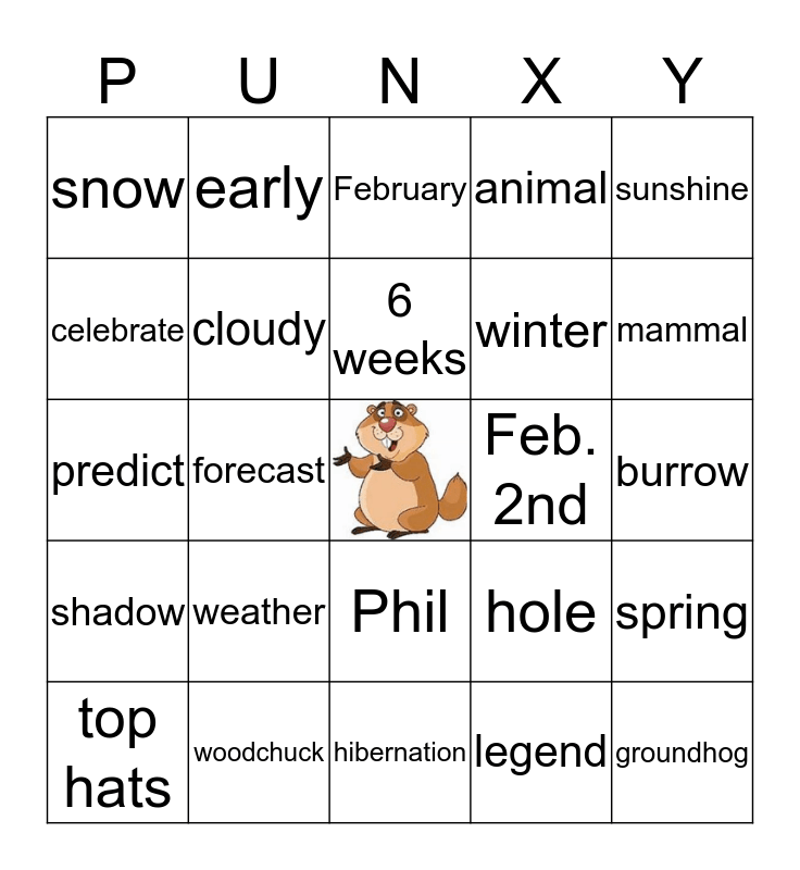 This bingo card has a free space and 24 words: weather, woodchuck, 6 weeks, top hats, sunshine, snow, celebrate, early, Feb. 2nd, Phil, winter, predict, hole, spring, cloudy, legend, burrow, February, mammal, forecast, groundhog, shadow, animal and hibernation.