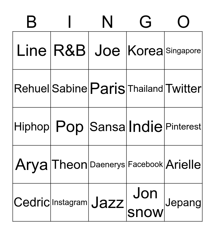This bingo card has a free space and 24 words: Theon, Instagram, Paris, Cedric, Singapore, Line, Rehuel, R&B, Indie, Daenerys, Thailand, Hiphop, Facebook, Arielle, Sabine, Jon snow, Pinterest, Joe, Twitter, Pop, Jepang, Arya, Korea and Jazz.