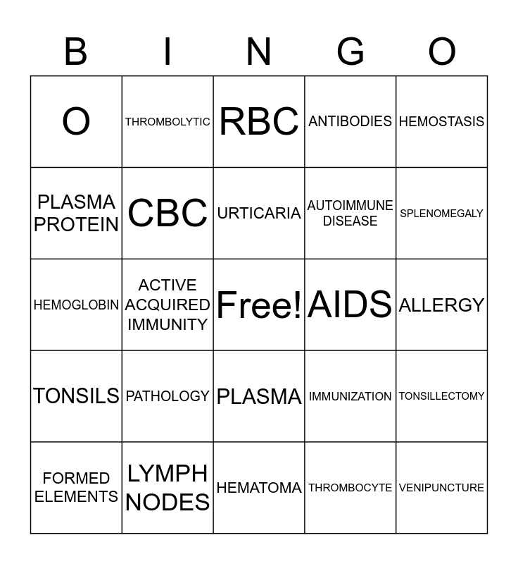 This bingo card has a free space and 29 words: FORMED ELEMENTS, Ig, ACTIVE ACQUIRED IMMUNITY, WBC, O, RBC, CBC, PATHOLOGY, AIDS, LYMPH NODES, ALLERGY, VENIPUNCTURE, HEMATOMA, THROMBOCYTE, SPLENOMEGALY, MONONUCLEOSIS, PLASMA, TONSILS, HEMOSTASIS, HEMOGLOBIN, IMMUNIZATION, AB, AUTOIMMUNE DISEASE, PLASMA PROTEIN, ANTIBODIES, THROMBOLYTIC, TONSILLECTOMY, URTICARIA and HIV.