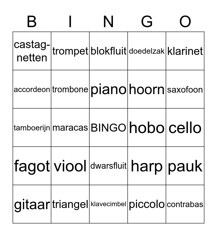This bingo card has a free space and 24 words: viool, triangel, piano, gitaar, klarinet, castag- netten, accordeon, trompet, hobo, dwarsfluit, hoorn, tamboerijn, harp, pauk, trombone, piccolo, cello, blokfluit, saxofoon, maracas, contrabas, fagot, doedelzak and klavecimbel.