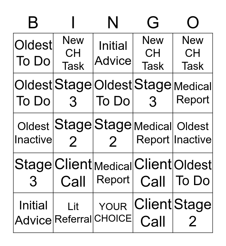 This bingo card has 25 words: Stage 3, Lit Referral, Stage 2, Client Call, New CH Task, Oldest To Do, New CH Task, Initial Advice, Medical Report, Oldest To Do, Oldest To Do, Stage 3, YOUR CHOICE, Client Call, Medical Report, Initial Advice, Stage 2, Oldest To Do, Stage 3, Oldest Inactive, Oldest Inactive, Client Call, Medical Report, New CH Task and Stage 2.