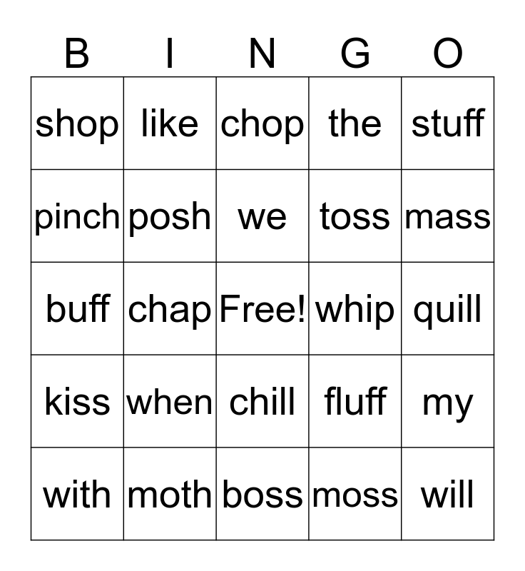 This bingo card has a free space and 29 words: with, chin, chap, shin, shop, chop, posh, when, whip, moth, quill, will, boss, moss, mass, pill, chill, kiss, stuff, buff, fluff, doll, toss, pinch, the, like, my, we and are.