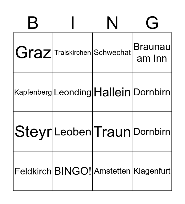 This bingo card has 28 words: Wien, Salzburg, Steyr, Wels, Leonding, Schwechat, Traiskirchen, Klagenfurt, BINGO!, Wolfsberg, Traun, Braunau am Inn, Linz, Kufstein, Leoben, Baden bei Wien, Sankt Pölten, Hallein, Dornbirn, Mödling, Graz, Villach, Feldkirch, Dornbirn, Amstetten, Bregenz, Kapfenberg and Hallein.