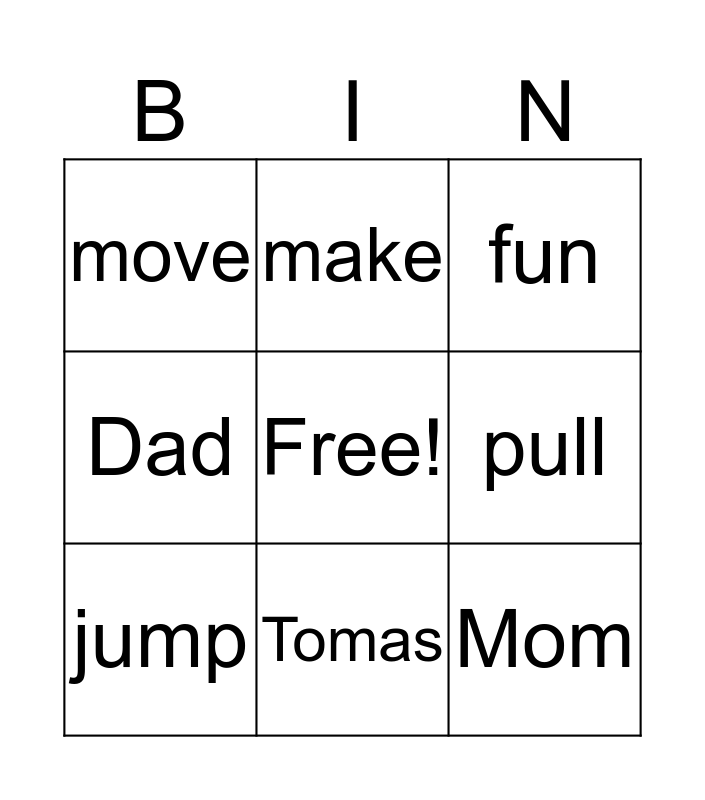 This bingo card has a free space and 8 words: pull, fun, make, jump, move, Mom, Dad and Tomas.