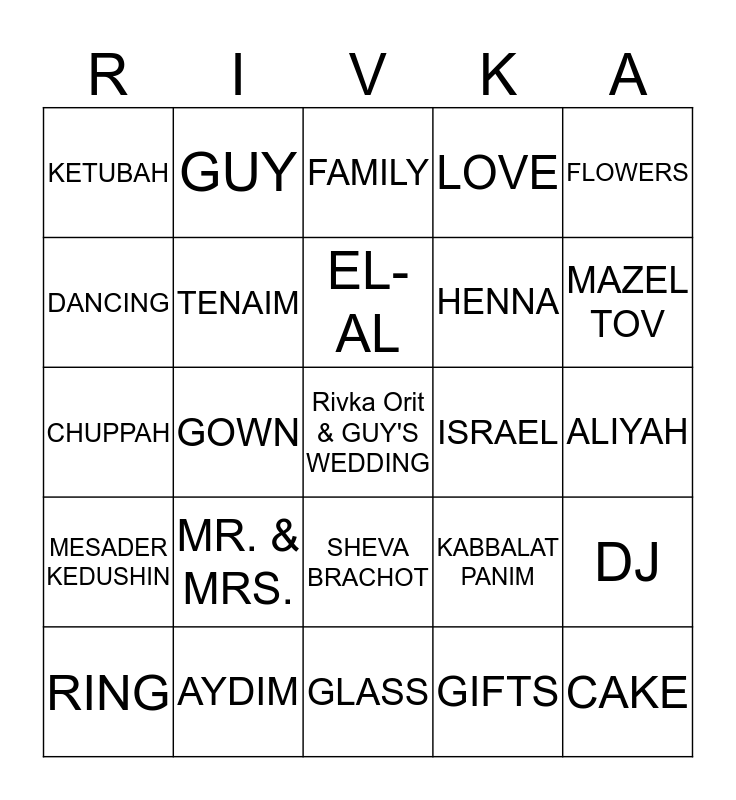 This bingo card has a free space and 29 words: RING, KALLAH, GOWN, CHATAN, KETUBAH, FAMILY, TENAIM, MR. & MRS., ISRAEL, AYDIM, ALIYAH, CAKE, GLASS, GIFTS, MAZEL TOV, FRIEND, SHEVA BRACHOT, MESADER KEDUSHIN, FLOWERS, CHUPPAH, KABBALAT PANIM, VEIL, HENNA, DANCING, LOVE, GUY, DJ, EL-AL and L'CHAIM.