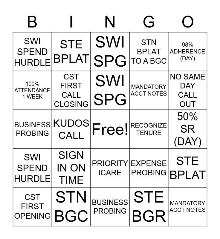 This bingo card has a free space and 24 words: SIGN IN ON TIME, STN BGC, SWI SPG, CST FIRST OPENING, 98% ADHERENCE (DAY), SWI SPEND HURDLE, 100% ATTENDANCE 1 WEEK, STE BPLAT, RECOGNIZE TENURE, PRIORITY ICARE, MANDATORY ACCT NOTES, BUSINESS PROBING, EXPENSE PROBING, STE BPLAT, CST FIRST CALL CLOSING, STE BGR, 50% SR (DAY), SWI SPG, NO SAME DAY CALL OUT, KUDOS CALL, MANDATORY ACCT NOTES, SWI SPEND HURDLE, STN BPLAT TO A BGC and BUSINESS PROBING.