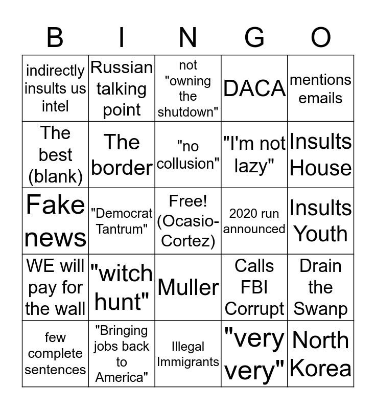 This bingo card has a free space and 24 words: few complete sentences, "witch hunt", "no collusion", "very very", mentions emails, indirectly insults us intel, Russian talking point, not "owning the shutdown", 2020 run announced, Insults Youth, Fake news, The border, Calls FBI Corrupt, Drain the Swanp, The best (blank), "Bringing jobs back to America", Illegal Immigrants, DACA, Insults House, WE will pay for the wall, "Democrat Tantrum", Muller, "I'm not lazy" and North Korea.