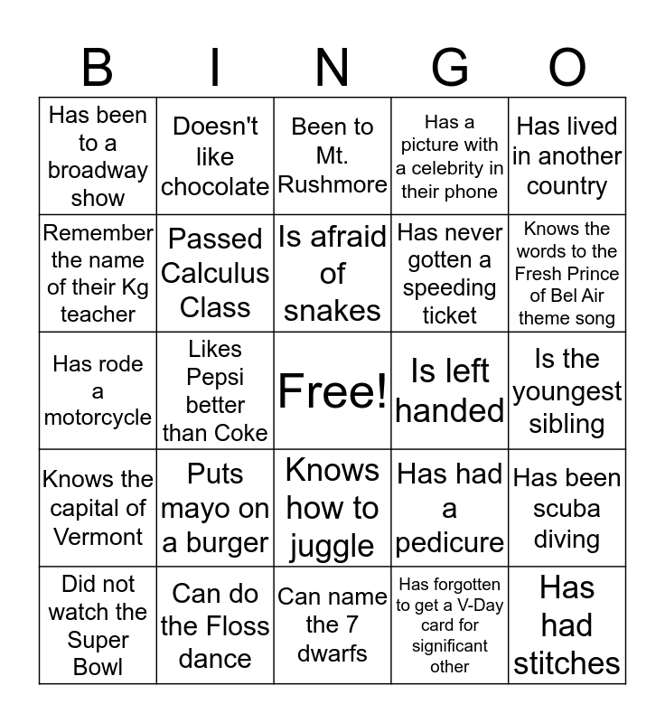 This bingo card has a free space and 24 words: Puts mayo on a burger, Can do the Floss dance, Is afraid of snakes, Did not watch the Super Bowl, Has lived in another country, Has been to a broadway show, Remember the name of their Kg teacher, Doesn't like chocolate, Is left handed, Knows how to juggle, Has never gotten a speeding ticket, Has rode a motorcycle, Has had a pedicure, Has been scuba diving, Passed Calculus Class, Has forgotten to get a V-Day card for significant other, Is the youngest sibling, Been to Mt. Rushmore, Knows the words to the Fresh Prince of Bel Air theme song, Likes Pepsi better than Coke, Has had stitches, Knows the capital of Vermont, Has a picture with a celebrity in their phone and Can name the 7 dwarfs.