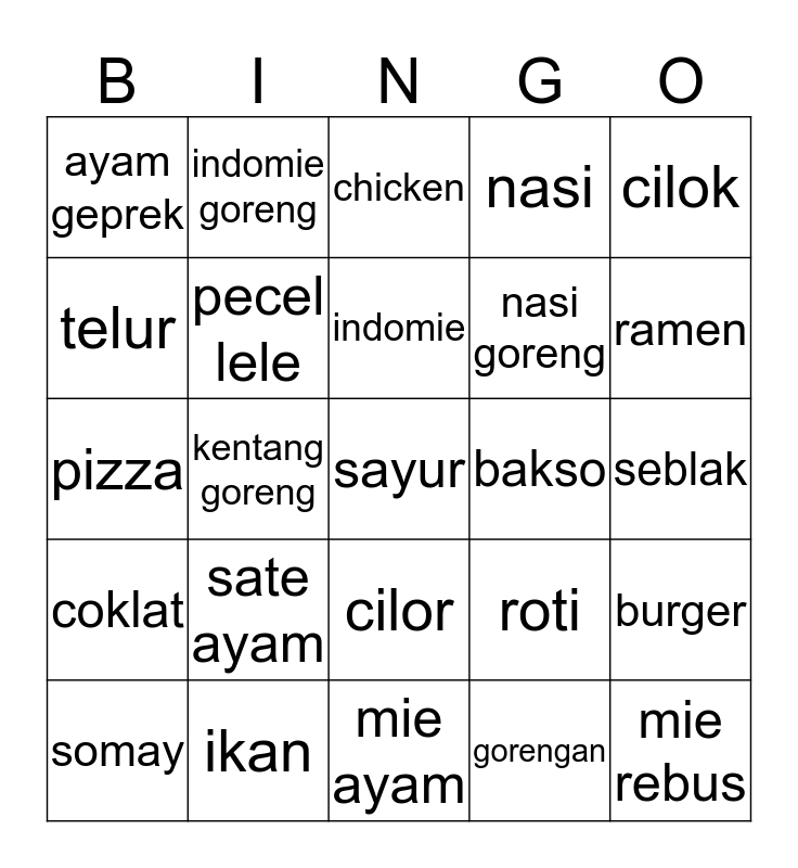 This bingo card has 25 words: sate ayam, mie ayam, indomie, somay, cilok, ayam geprek, telur, indomie goreng, bakso, cilor, nasi goreng, pizza, roti, burger, pecel lele, mie rebus, seblak, chicken, ramen, kentang goreng, sayur, ikan, coklat, nasi and gorengan.