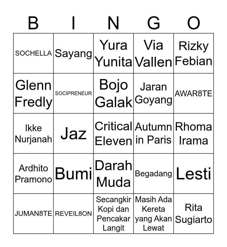 This bingo card has a free space and 24 words: Bumi, REVEIL8ON, Bojo Galak, JUMAN8TE, Rizky Febian, SOCHELLA, Glenn Fredly, Sayang, Autumn in Paris, Darah Muda, Jaran Goyang, Ikke Nurjanah, Begadang, Lesti, SOCIPRENEUR, Masih Ada Kereta yang Akan Lewat, Rhoma Irama, Yura Yunita, AWAR8TE, Jaz, Rita Sugiarto, Ardhito Pramono, Via Vallen and Secangkir Kopi dan Pencakar Langit.