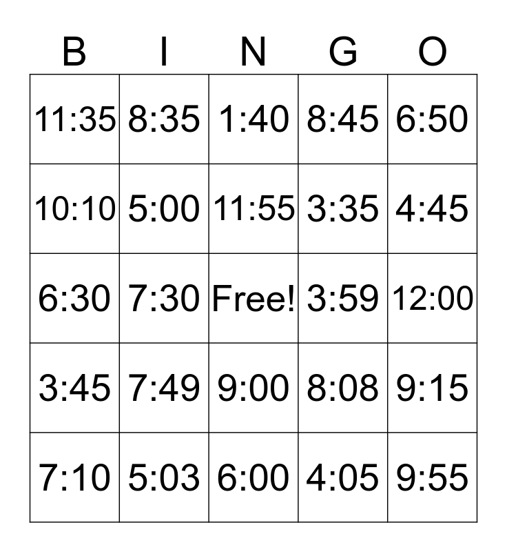 This bingo card has a free space and 34 words: 9:15, 4:05, 1:20, 2:18, 3:45, 5:00, 6:50, 7:10, 8:35, 10:40, 11:55, 1:40, 2:45, 12:30, 3:59, 4:45, 5:03, 6:30, 7:49, 8:08, 9:00, 10:15, 11:35, 12:00, 6:00, 9:55, 8:45, 11:25, 3:35, 10:10, 2:50, 7:30, 9:15 and 12:55.