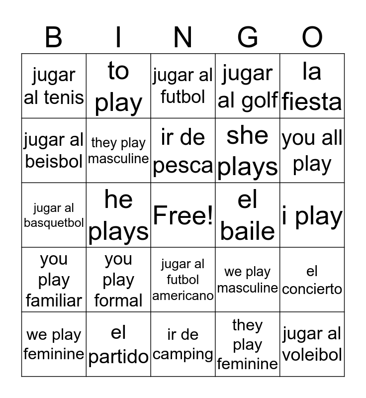 This bingo card has a free space and 24 words: you play formal, el partido, ir de pesca, we play feminine, la fiesta, jugar al tenis, jugar al beisbol, to play, el baile, jugar al futbol americano, she plays, jugar al basquetbol, we play masculine, el concierto, they play masculine, they play feminine, i play, jugar al futbol, you all play, he plays, jugar al voleibol, you play familiar, jugar al golf and ir de camping.