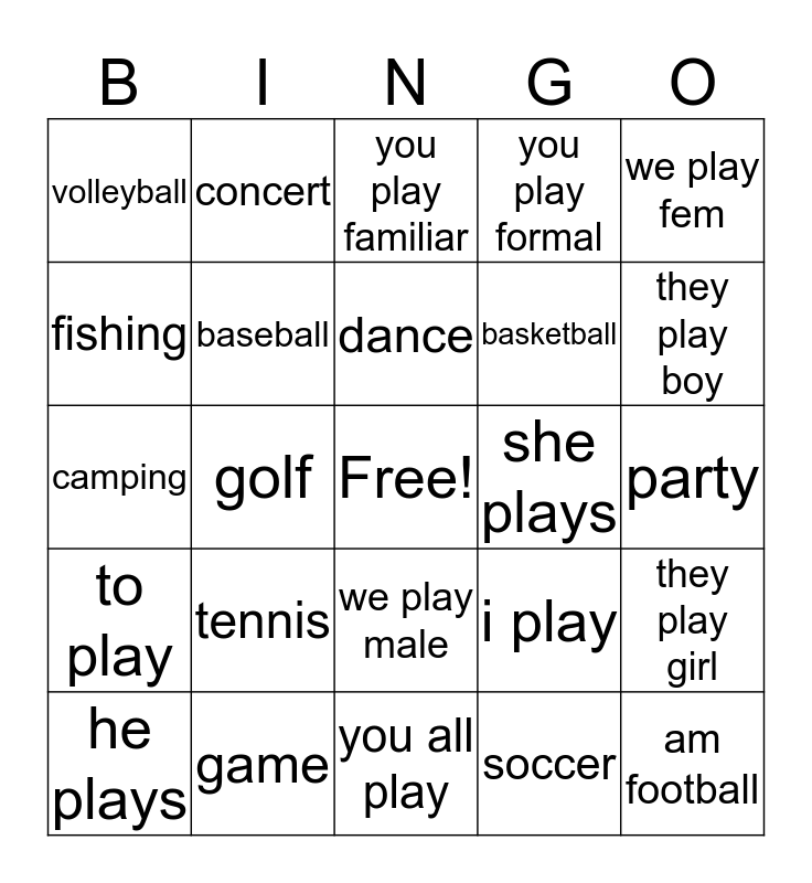 This bingo card has a free space and 24 words: tennis, game, dance, he plays, we play fem, volleyball, fishing, concert, she plays, we play male, basketball, camping, i play, they play girl, baseball, soccer, party, you play familiar, they play boy, golf, am football, to play, you play formal and you all play.