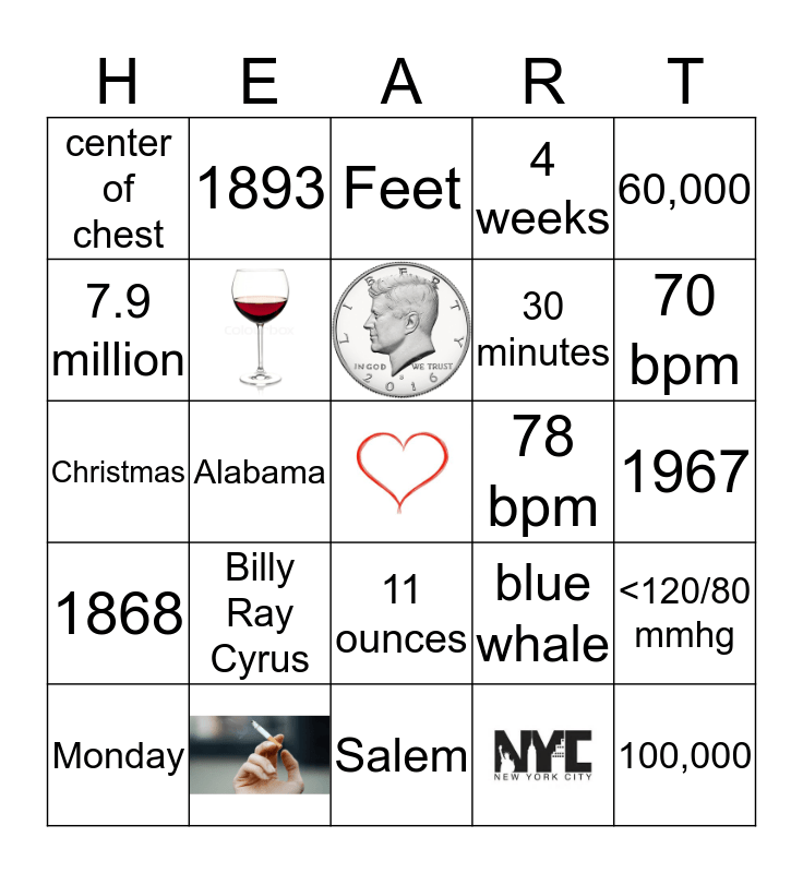 This bingo card has 5 images, a free space and 23 words: 60,000, center of chest, Salem, 78 bpm, <120/80 mmhg, Christmas, Alabama, blue whale, 100,000, 7.9 million, 735,000, 11 ounces, 4 weeks, 70 bpm, Monday, 1893, Toni Braxton, 30 minutes, 1967, 1868, Billy Ray Cyrus, Feet and men.