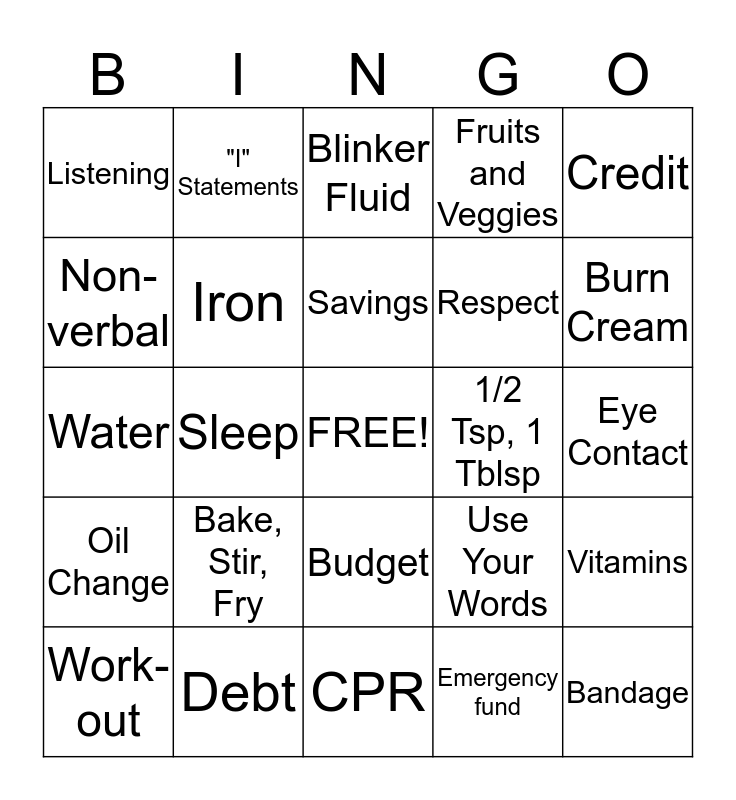 This bingo card has a free space and 26 words: Budget, Emergency fund, Savings, Debt, Credit, Listening, Non-verbal, "I" Statements, Eye Contact, Use Your Words, Respect, Water, Vitamins, Work-out, Sleep, Stress Management, Fruits and Veggies, Oil Change, Blinker Fluid, Bandage, Burn Cream, CPR, 1/2 Tsp, 1 Tblsp, Bake, Stir, Fry, Iron and Sort Laundry.