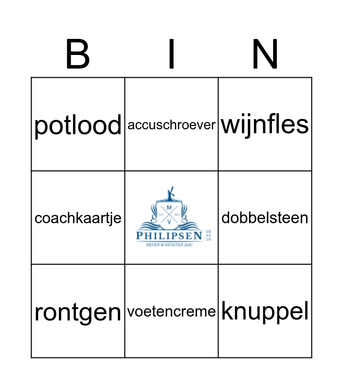 This bingo card has a free space and 23 words: rozen, handje, voetencreme, knuffel, knuppel, potlood, dobbelsteen, accuschroever, organizer, speelgoedauto, annemiek, schoonheid, mandje, hammam, voetbal, zweepje, wijnfles, gereedschap, rontgen, krullers, coachkaartje, bubbels and badslipper.