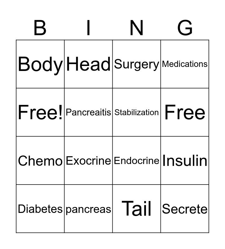 This bingo card has 16 words: pancreas, Insulin, Surgery, Body, Chemo, Head, Endocrine, Tail, Free!, Pancreaitis, Diabetes, Medications, Exocrine, Free, Stabilization and Secrete.