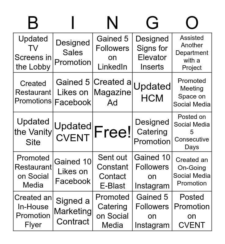 This bingo card has a free space and 24 words: Gained 10 Likes on Facebook, Signed a Marketing Contract, Created a Magazine Ad, Created an In-House Promotion Flyer, Assisted Another Department with a Project, Updated TV Screens in the Lobby, Created Restaurant Promotions, Designed Sales Promotion, Designed Catering Promotion, Sent out Constant Contact E-Blast, Updated HCM, Updated the Vanity Site, Gained 10 Followers on Instagram, Created an On-Going Social Media Promotion, Gained 5 Likes on Facebook, Gained 5 Followers on Instagram, Posted on Social Media 5 Consecutive Days, Gained 5 Followers on LinkedIn, Promoted Meeting Space on Social Media, Updated CVENT, Posted Promotion on CVENT, Promoted Restaurant on Social Media, Designed Signs for Elevator Inserts and Promoted Catering on Social Media.