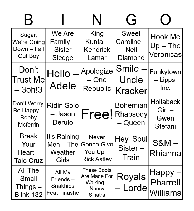 This bingo card has a free space and 43 words: Day N Night – Kid Cuddi, Happy – Pharrell Williams, Hoops – The Reubens, All The Small Things – Blink 182, Shake It Off – Taylor Swift, Royals – Lorde, King Kunta – Kendrick Lamar, Lean On – Major Lazer, Hook Me Up – The Veronicas, All My Friends – Snakhips Feat Tinashe, Sweet Caroline – Neil Diamond, Bohemian Rhapsody – Queen, Never Gonna Give You Up – Rick Astley, It’s Raining Men – The Weather Girls, 500 Miles – The Proclaimers, These Boots Are Made For Walking – Nancy Sinatra, You’re So Vain – Carly Simon, Don’t Worry, Be Happy – Bobby Mcferrin, Eye Of The Tiger – Survivor, Funkytown – Lipps, Inc., We Are Family – Sister Sledge, Abc – Jackson 5, Ymca – Village People, Sugar, We’re Going Down – Fall Out Boy, Irreplaceable – Beyonce, Hollaback Girl – Gwen Stefani, Sk8er Boi – Avril Lavigne, Tik Tok – Ke$Ha, Hey, Soul Sister – Train, Break Your Heart – Taio Cruz, Get Low – Lil Jon & The Eatside Boyz, S&M – Rhianna, Billionaire – Travie Mccoy Feat. Bruno Mars, Ridin Solo – Jason Derulo, Run It – Chris Brown, Havent Met You Yet – Michael Buble, Baby – Justin Bieber, Apologize – One Republic, Don’t Trust Me – 3oh!3, Smile – Uncle Kracker, One Dance – Drake, Hello – Adele and Can’t Feel My Face – The Weekend.