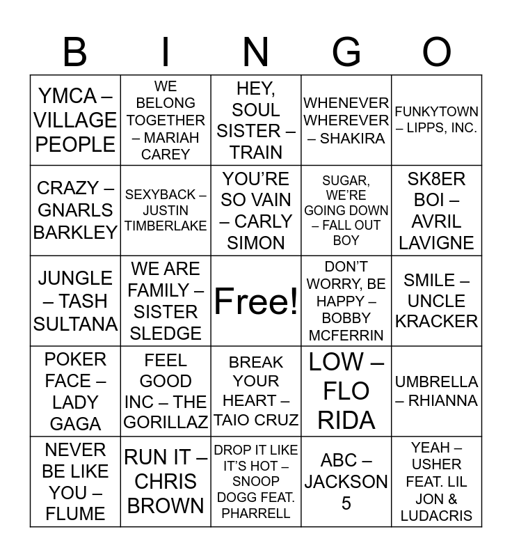 This bingo card has a free space and 50 words: TAKE ME OUT – FRANZ FERDINAND, YEAH – USHER FEAT. LIL JON & LUDACRIS, SINCE U BEEN GONE – KELLY CLARKSON, DROP IT LIKE IT’S HOT – SNOOP DOGG FEAT. PHARRELL, FEEL GOOD INC – THE GORILLAZ, GOLD DIGGER – KAYNE WEST, WE BELONG TOGETHER – MARIAH CAREY, PRETTY FLY – THE OFFSPRING, CRAZY – GNARLS BARKLEY, REHAB – AMY WINEHOUSE, SEXYBACK – JUSTIN TIMBERLAKE, WHENEVER WHEREVER – SHAKIRA, UMBRELLA – RHIANNA, LOW – FLO RIDA, 500 MILES – THE PROCLAIMERS, THESE BOOTS ARE MADE FOR WALKING – NANCY SINATRA, YOU’RE SO VAIN – CARLY SIMON, DON’T WORRY, BE HAPPY – BOBBY MCFERRIN, EYE OF THE TIGER – SURVIVOR, FUNKYTOWN – LIPPS, INC., WE ARE FAMILY – SISTER SLEDGE, ABC – JACKSON 5, YMCA – VILLAGE PEOPLE, SUGAR, WE’RE GOING DOWN – FALL OUT BOY, IRREPLACEABLE – BEYONCE, HOLLABACK GIRL – GWEN STEFANI, SK8ER BOI – AVRIL LAVIGNE, TIK TOK – KE$HA, HEY, SOUL SISTER – TRAIN, BREAK YOUR HEART – TAIO CRUZ, GET LOW – LIL JON & THE EATSIDE BOYZ, S&M – RHIANNA, BILLIONAIRE – TRAVIE MCCOY FEAT. BRUNO MARS, RIDIN SOLO – JASON DERULO, RUN IT – CHRIS BROWN, HAVENT MET YOU YET – MICHAEL BUBLE, BABY – JUSTIN BIEBER, APOLOGIZE – ONE REPUBLIC, DON’T TRUST ME – 3OH!3, SMILE – UNCLE KRACKER, ONE DANCE – DRAKE, HELLO – ADELE, CAN’T FEEL MY FACE – THE WEEKEND, HARLEM SHAKE – SNAKE HIPS, NEVER BE LIKE YOU – FLUME, JUNGLE – TASH SULTANA, NOSEBLEED SECTION – HILLTOP HOODS, STOLEN DANCE – MILKY CHANCE, POKER FACE – LADY GAGA and I KISSED A GIRL – KATY PERRY.
