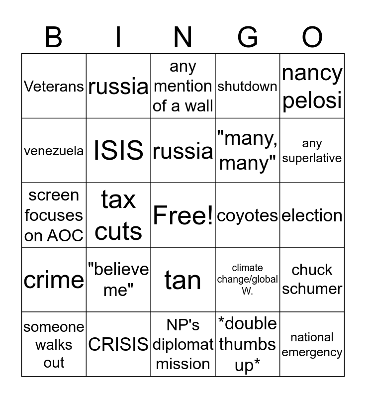 This bingo card has a free space and 32 words: *double thumbs up*, fake news, tax cuts, space force, crime, ISIS, nancy pelosi, chuck schumer, russia, bipartisan, russia, any mention of a wall, jobs, drugs, coyotes, ICE-says something positive, someone walks out, screen focuses on AOC, tan, "believe me", climate change/global W., fine people, election, CRISIS, national emergency, shutdown, "many, many", venezuela, Veterans, NP's diplomat mission, steel slats and any superlative.