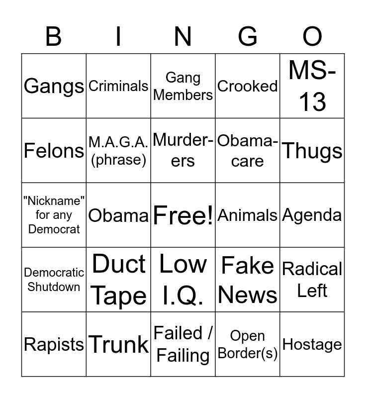 This bingo card has a free space and 24 words: Duct Tape, Trunk, Murder- ers, Rapists, MS-13, Gangs, Felons, Criminals, Animals, Low I.Q., Obama-care, "Nickname" for any Democrat, Fake News, Radical Left, M.A.G.A. (phrase), Open Border(s), Agenda, Gang Members, Thugs, Obama, Hostage, Democratic Shutdown, Crooked and Failed / Failing.