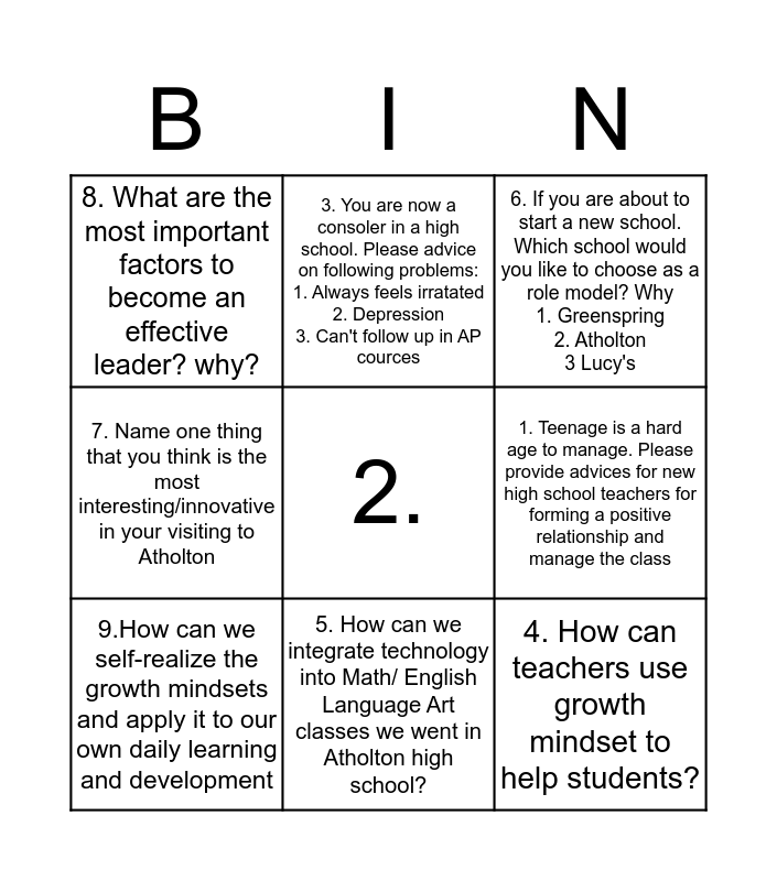 This bingo card has a free space and 8 words: 1. Teenage is a hard age to manage. Please provide advices for new high school teachers for forming a positive relationship and manage the class, 6. If you are about to start a new school. Which school would you like to choose as a role model? Why 1. Greenspring 2. Atholton 3 Lucy's, 3. You are now a consoler in a high school. Please advice on following problems: 1. Always feels irratated 2. Depression 3. Can't follow up in AP cources, 9.How can we self-realize the growth mindsets and apply it to our own daily learning and development, 8. What are the most important factors to become an effective leader? why?, 4. How can teachers use growth mindset to help students?, 7. Name one thing that you think is the most interesting/innovative in your visiting to Atholton and 5. How can we integrate technology into Math/ English Language Art classes we went in Atholton high school?.
