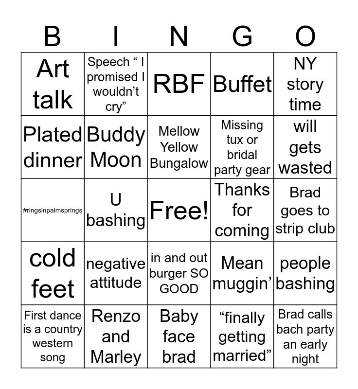 This bingo card has a free space and 31 words: Baby face brad, 5 o’clock shadow, U bashing, Taking a bite outta lime talk, Art talk, RBF, Buddy Moon, Mean muggin’, Thanks for coming, “finally getting married”, Brad goes to strip club, Brad calls bach party an early night, so stressed/ tired, talking up the weather, will gets wasted, connie famous sayings, people bashing, negative attitude, cold feet, in and out burger SO GOOD, NY story time, Brad gets flipped off, First dance is a country western song, Speech “ I promised I wouldn’t cry”, Missing tux or bridal party gear, Plated dinner, Buffet, #ringsinpalmsprings, Renzo and Marley, Mellow Yellow Bungalow and Wedding Breakdown.
