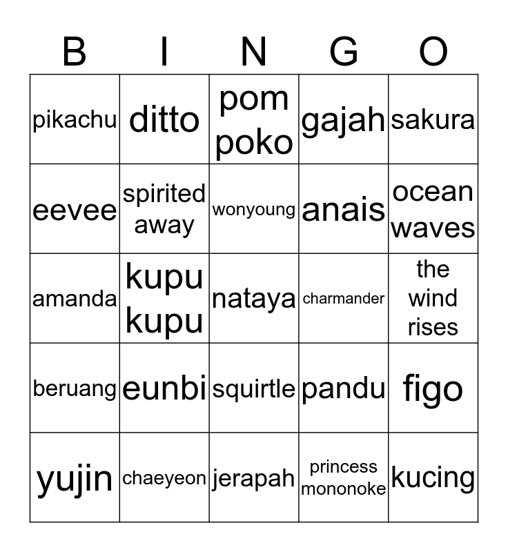 This bingo card has a free space and 24 words: eunbi, chaeyeon, wonyoung, yujin, sakura, pikachu, eevee, ditto, charmander, squirtle, anais, amanda, pandu, figo, spirited away, princess mononoke, the wind rises, pom poko, ocean waves, kupu kupu, kucing, beruang, gajah and jerapah.