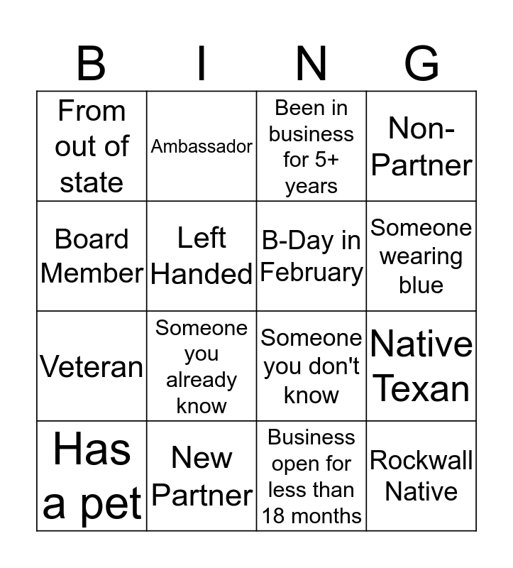 This bingo card has 16 words: New Partner, Native Texan, Been in business for 5+ years, From out of state, Veteran, Ambassador, Someone you don't know, Business open for less than 18 months, Board Member, Left Handed, Has a pet, Non-Partner, Someone you already know, Someone wearing blue, B-Day in February and Rockwall Native.