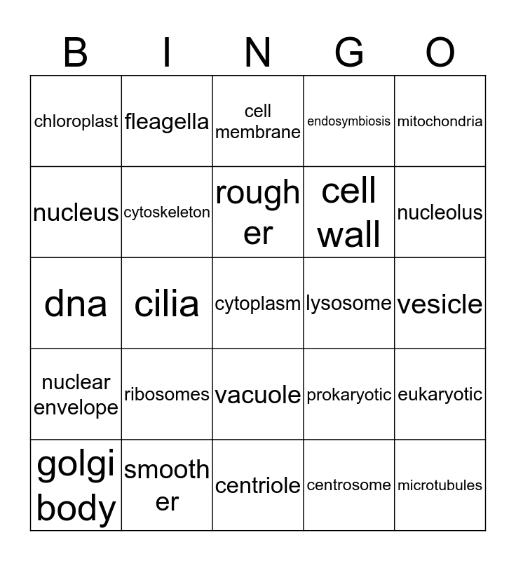 This bingo card has a free space and 24 words: ribosomes, smooth er, rough er, golgi body, mitochondria, chloroplast, nucleus, fleagella, lysosome, vacuole, cell wall, dna, prokaryotic, eukaryotic, cytoskeleton, centrosome, vesicle, cell membrane, nucleolus, cilia, microtubules, nuclear envelope, endosymbiosis and centriole.