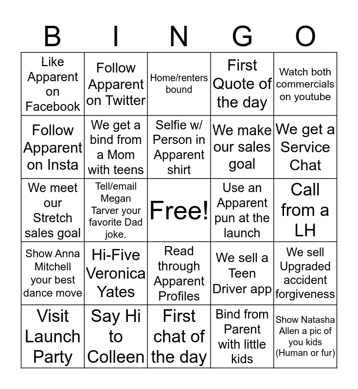 This bingo card has a free space and 24 words: Hi-Five Veronica Yates, Say Hi to Colleen, Selfie w/ Person in Apparent shirt, Visit Launch Party, Watch both commercials on youtube, Like Apparent on Facebook, Follow Apparent on Insta, Follow Apparent on Twitter, Use an Apparent pun at the launch, Read through Apparent Profiles, We make our sales goal, We meet our Stretch sales goal, We sell a Teen Driver app, We sell Upgraded accident forgiveness, We get a bind from a Mom with teens, Bind from Parent with little kids, Call from a LH, Home/renters bound, We get a Service Chat, Tell/email Megan Tarver your favorite Dad joke., Show Natasha Allen a pic of you kids (Human or fur), Show Anna Mitchell your best dance move, First Quote of the day and First chat of the day.