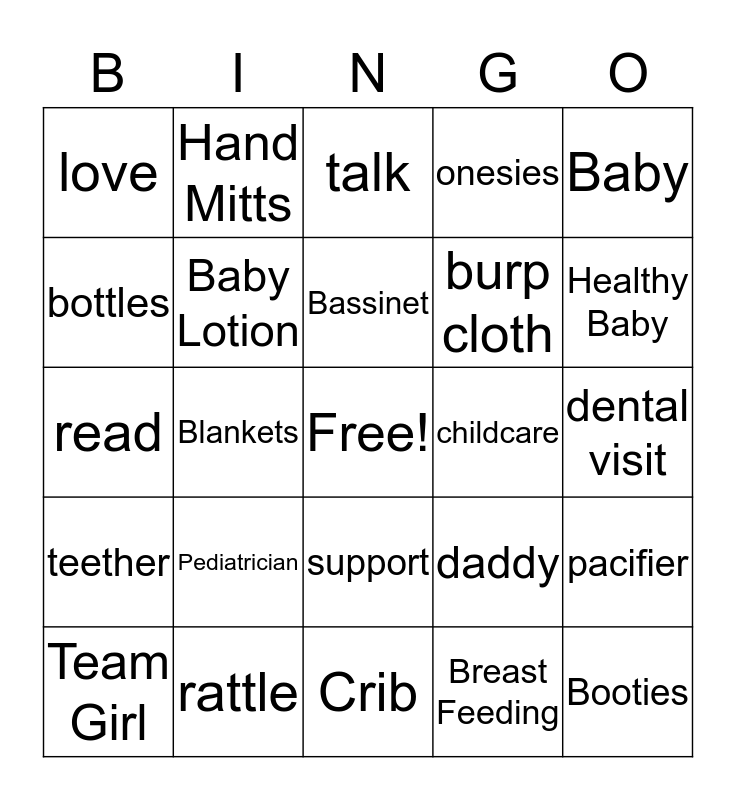 This bingo card has a free space and 49 words: Diapers, Booties, stroller, Crib, Pediatrician, Wipes, Hand Mitts, car seat, bottles, mommy, Baby Lotion, onesies, pacifier, daddy, Baby Wash, Baby hats, Bassinet, childcare, new to the world, Baby, Blankets, Breast Feeding, love, burp cloth, bibs, Healthy Baby, Team Girl, Team Boy, support, teether, thermometer, gripe water, baby clothes, diaper rash cream, rattle, postpartum care, Family planning methods, wic, dental visit, burp, bouncy chair, rock, baby music, books, read, talk, sing, coo and bond.