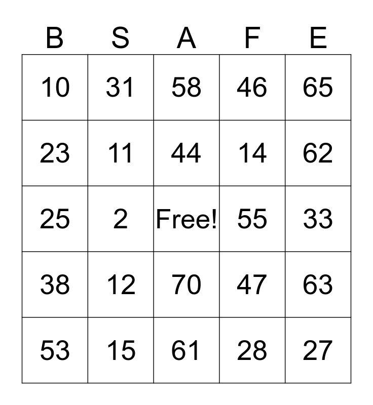 This bingo card has a free space and 24 words: 12, 15, 44, 53, 65, 10, 23, 31, 55, 70, 14, 25, 47, 63, 11, 28, 33, 58, 62, 2, 27, 38, 46 and 61.