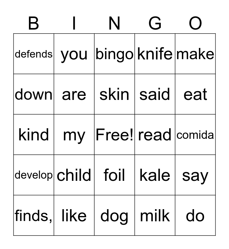 This bingo card has a free space and 29 words: lay, like, bingo, tell, make, defends, are, skin, read, say, finds,, my, milk, do, kind, kid, dog, kale, eat, develop, child, cat, said, comida, down, you, foil, knife and vase.