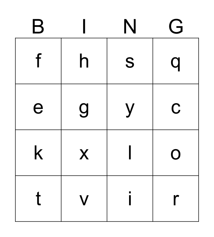 This bingo card has 26 words: a, b, c, d, e, f, g, h, i, j, k, l, m, n, o, p, q, r, s, t, x, u, v, w, y and z.
