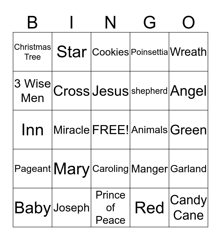 This bingo card has a free space and 24 words: Mary, Joseph, Jesus, Baby, Wreath, Christmas Tree, 3 Wise Men, Star, Animals, Caroling, shepherd, Inn, Manger, Garland, Cross, Red, Green, Cookies, Angel, Miracle, Candy Cane, Pageant, Poinsettia and Prince of Peace.