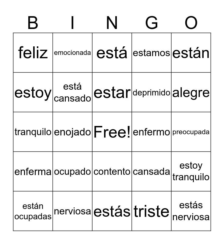 198 | Español Presente Progresivo Bingo | pg 198 ashleigh 2 | estar emotions and conditions, pg 198 | estar emotions and conditions, pg 198