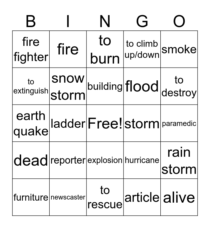 This bingo card has a free space and 24 words: reporter, newscaster, building, furniture, smoke, fire fighter, to extinguish, fire, storm, explosion, flood, earth quake, hurricane, rain storm, snow storm, article, paramedic, to burn, to destroy, ladder, alive, dead, to climb up/down and to rescue.