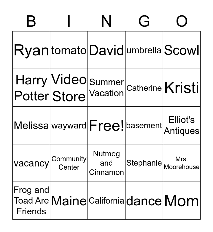 This bingo card has a free space and 29 words: Frog and Toad Are Friends, stinks a big one, wayward, Jason, Ryan, David, Video Store, Community Center, basement, Maine, Elliot's Antiques, Mom, California, dance, Kristi, guitar, Nutmeg and Cinnamon, vacancy, Scowl, Melissa, Stephanie, perched, Catherine, Harry Potter, umbrella, tomato, Mrs. Moorehouse, Summer Vacation and artist.