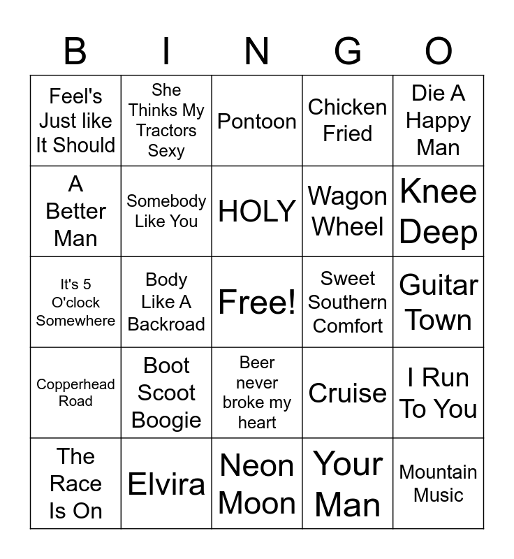 This bingo card has a free space and 51 words: Friends In Low Places, Mountain Music, Guitars, Cadlillac's, Neon Moon, Boot Scoot Boogie, Family Tradition, She Thinks My Tractors Sexy, Sold (Grundy County Auction), A Better Man, Strawberry Wine, Somebody Like You, Chicken Fried, I Run To You, Cruise, Tennesse Whiskey, Rednecker, HOLY, Sweet Southern Comfort, Like A Wrecking Ball, Die A Happy Man, Body Like A Backroad, Your Man, Feel's Just like It Should, Wagon Wheel, We Danced, Drink In My Hand, Knee Deep, The Thunder Rolls, The Race Is On, Pontoon, Country Girl (Shake It For Me), Callin' Baton Rouge, Bury Me In Dixie, Up Down, I Cross My Heart, Elvira, Whiskey Glasses, Dixieland Delight, Folsome Prison Blues, East Bound And Down, Guitar Town, Copperhead Road, How Forever Feels, Devil Went Down to Georgia, Good Directions, Blue Eyes Crying In The Rain, It's 5 O'clock Somewhere, Keep Your Hands To Yourself, Chattahoochie, Beer never broke my heart and The way I talk.