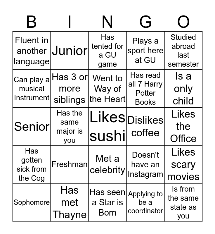 This bingo card has 25 words: Freshman, Has seen a Star is Born, Went to Way of the Heart, Sophomore, Studied abroad last semester, Fluent in another language, Can play a musical Instrument, Junior, Dislikes coffee, Met a celebrity, Has read all 7 Harry Potter Books, Senior, Doesn't have an Instagram, Likes scary movies, Has 3 or more siblings, Is from the same state as you, Likes the Office, Has tented for a GU game, Is a only child, Has the same major is you, Likes sushi, Has met Thayne, Has gotten sick from the Cog, Plays a sport here at GU and Applying to be a coordinator.