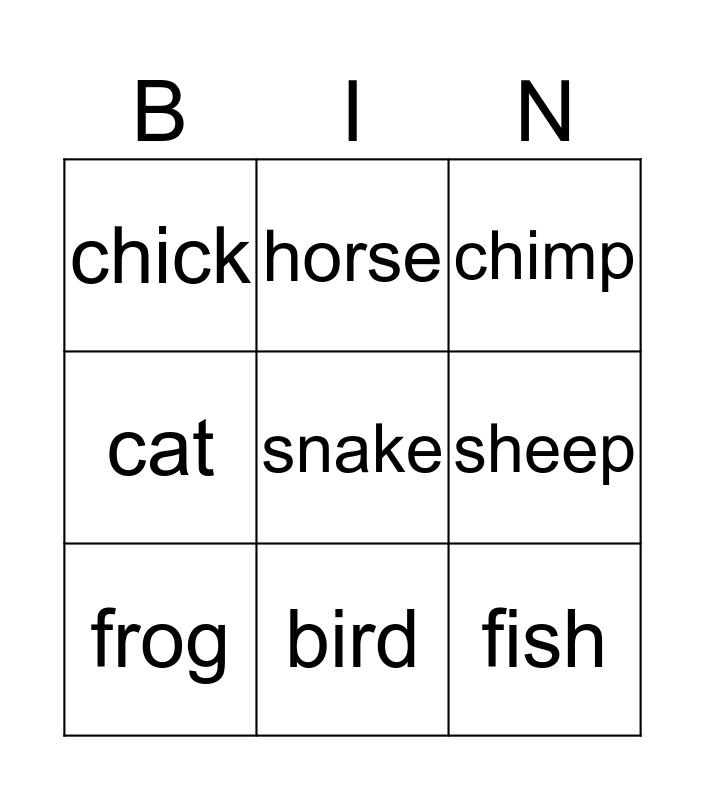 This bingo card has 9 words: frog, chimp, horse, cat, chick, sheep, snake, fish and bird.