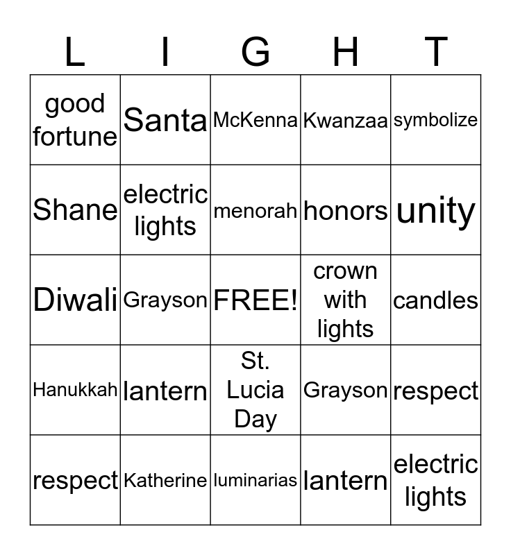 This bingo card has a free space and 24 words: lantern, Katherine, menorah, respect, symbolize, good fortune, Shane, Santa, crown with lights, St. Lucia Day, honors, Diwali, Grayson, respect, electric lights, lantern, candles, McKenna, unity, Grayson, electric lights, Hanukkah, Kwanzaa and luminarias.