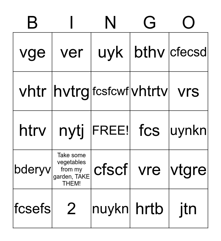This bingo card has a free space and 24 words: Take some vegetables from my garden, TAKE THEM!, 2, fcsfcwf, fcsefs, cfecsd, vge, vhtr, ver, fcs, cfscf, vhtrtv, htrv, vre, vtgre, hvtrg, hrtb, uynkn, uyk, vrs, nytj, jtn, bderyv, bthv and nuykn.