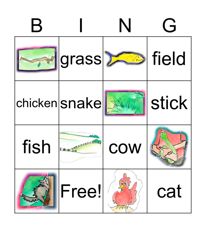 This bingo card has 14 images and 15 words: Free!, Free, ants, cat, chicken, cow, dinosaur, dog, fish, snake, field, grass, sky, stick and tree.