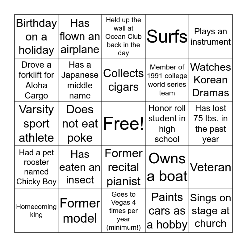 This bingo card has a free space and 24 words: Has eaten an insect, Former model, Collects cigars, Homecoming king, Plays an instrument, Birthday on a holiday, Drove a forklift for Aloha Cargo, Has flown an airplane, Honor roll student in high school, Former recital pianist, Member of 1991 college world series team, Varsity sport athlete, Owns a boat, Veteran, Has a Japanese middle name, Paints cars as a hobby, Has lost 75 lbs. in the past year, Held up the wall at Ocean Club back in the day, Watches Korean Dramas, Does not eat poke, Sings on stage at church, Had a pet rooster named Chicky Boy, Surfs and Goes to Vegas 4 times per year (minimum!).